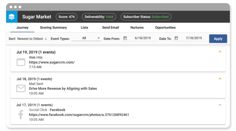 Keep Sales and Marketing aligned, and prevent leads from flowing out of the funnel. Sugar Market has native integrations with more CRMs than any other marketing automation platform. Whether you leverage the many benefits of Sugar Sell or choose to use another CRM vendor, we’ll keep your systems in sync so Sales and Marketing stay in perfect alignment.