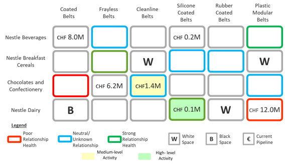 Product-BU view overlapped with relationship status, opportunities to grow new connections, and the level of activities is an indispensable asset for business leaders planning to grow sales. One view that both marketing and sales teams can relate to when working on strategic accounts.