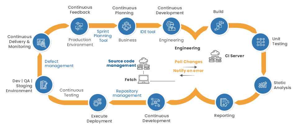 Our Development Methodology integrates DevOps principles and a robust CI/CD pipeline to ensure a seamless, iterative process from planning to deployment. Starting with continuous planning and feedback, we utilize tools like sprint planning and IDEs to maintain an efficient workflow. At each stage — build, testing, and deployment— our CI server automates critical tasks, including unit testing, static analysis, and defect management. This DevOps-driven approach with CI/CD practices enables continuous monitoring and rapid issue resolution, fostering agility and innovation through each development phase.